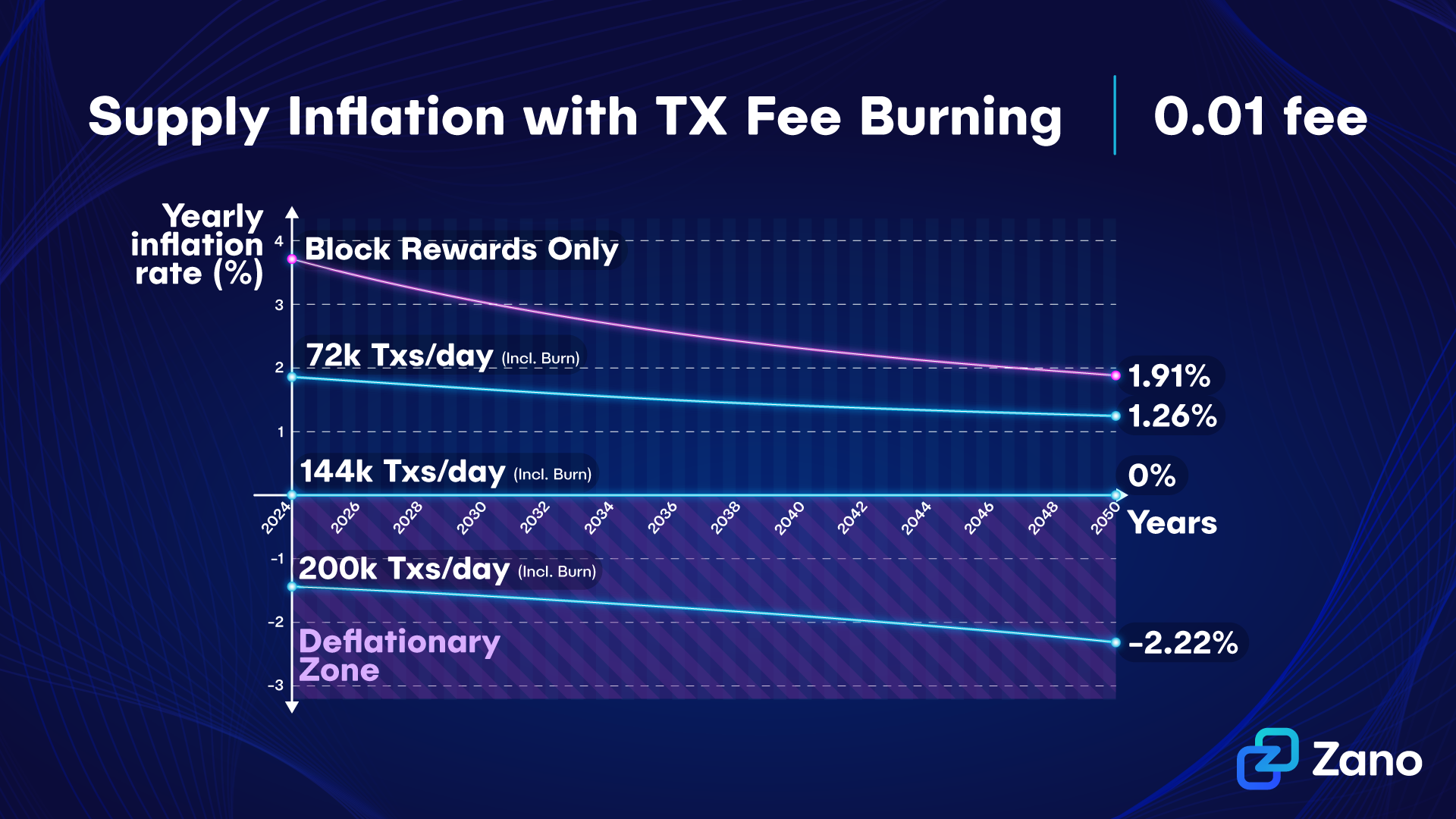 On Zano, all network fees are being burned, meaning that with enough network usage, the daily fee burning could surpass the emission from block rewards, resulting in supply becoming deflationary over time.