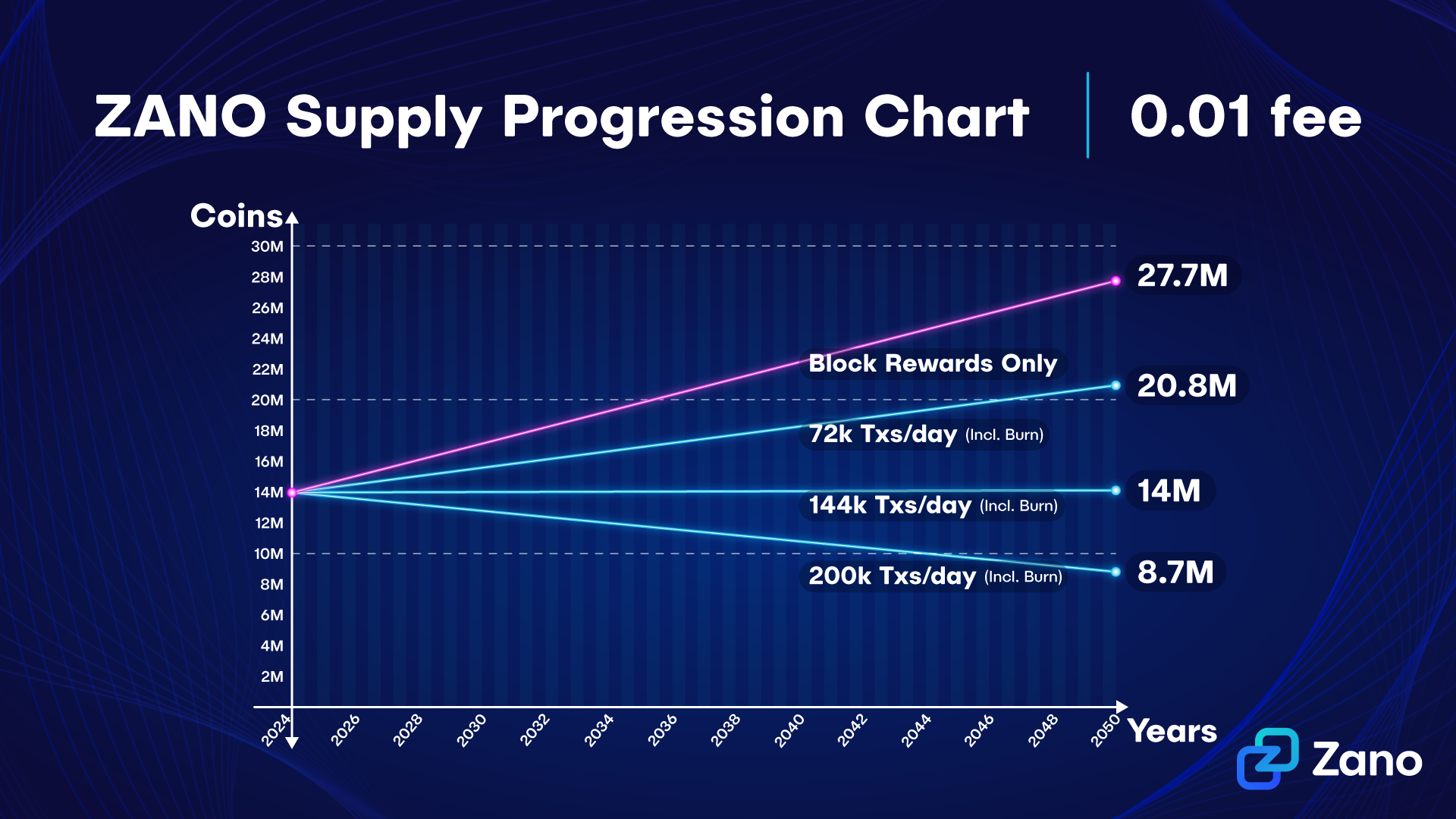 For practical purposes these charts assume a fixed fee, in reality, as Zano's price goes up (and the dynamic fee mechanism is implemented) fees will likely go down in Zano-denominated terms, slightly reducing the total burned over time, still, these graphs are useful to showcase the different trends the total supply can take based on network usage.