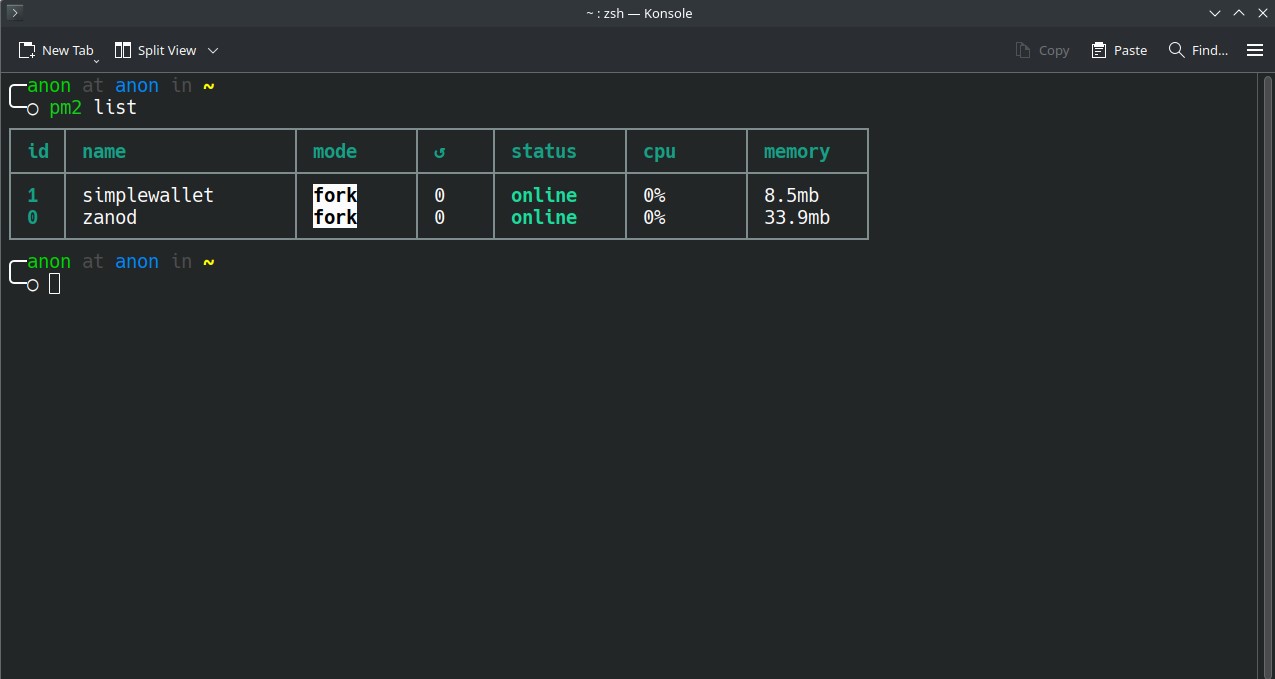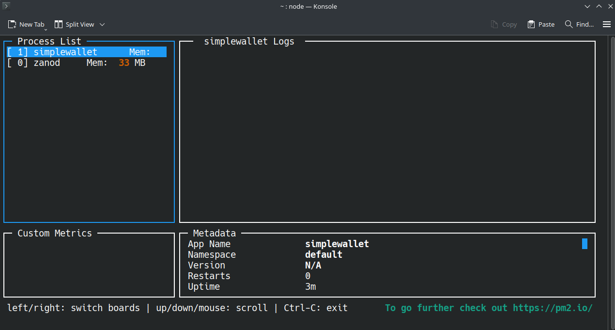 Now we want to start both zanod and simplewallet using PM2 process manager.