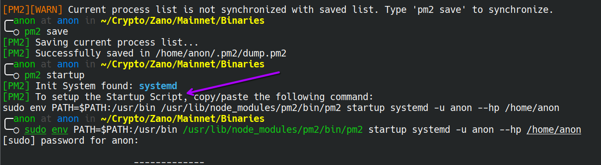 sudo env PATH=$PATH:/usr/bin /usr/lib/node_modules/pm2/bin/pm2 startup systemd -u anon --hp /home/anon